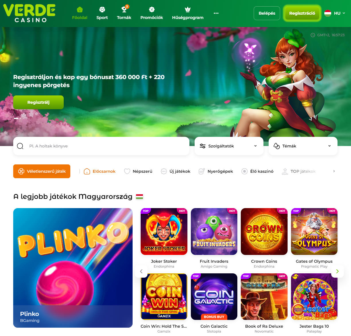Verde Casino – egy fiatal online platform, amely 2022-ben indult és Curaçaón van licencelve. A kaszinó több mint 5000 játékot kínál a vezető szolgáltatóktól, mint például a Betsoft, a Play’n Go és a Pragmatic Play, beleértve a nyerőgépeket, asztali játékokat, élő kereskedővel játszható játékokat és azonnali szórakozást. Az oldalon sportfogadási szekció is elérhető, amely bár még fejlesztés alatt áll, de már lefedi a főbb sportágakat. A kellemes zöld dizájn, több nyelven, köztük magyarul is elérhető támogatás és vonzó bónuszprogram teszi a Verde Casinót kényelmes választássá azoknak a játékosoknak, akik változatos játékélményre vágynak.