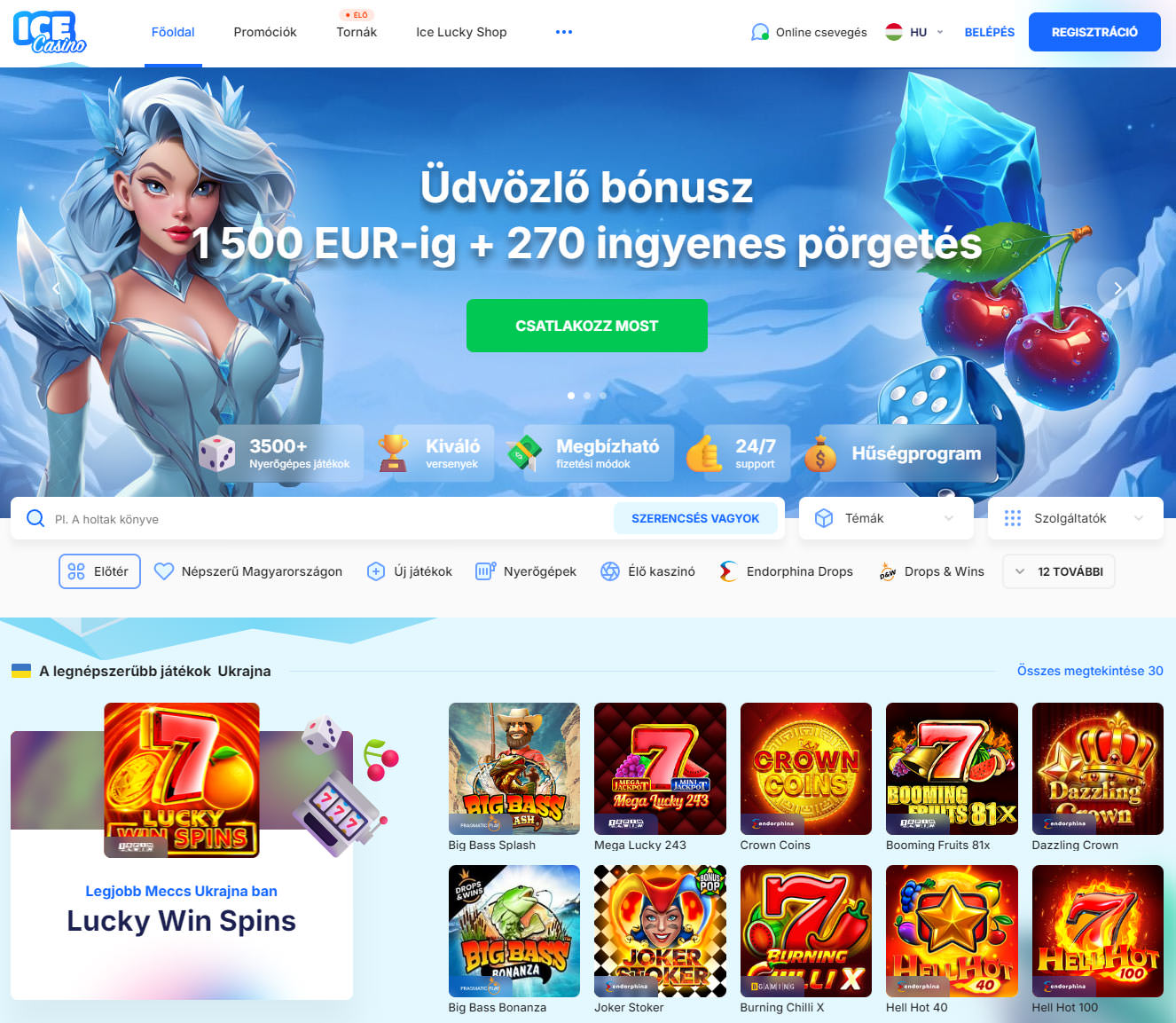 Az Ice Casino egy online kaszinó, amely 2021-ben alakult és Curaçao licenccel működik. A kaszinót a Brivio Limited vállalat irányítja, és több mint 3500 játékot kínál több mint 70 vezető fejlesztőtől, mint például a Play’n GO, a Pragmatic Play és a BGaming. A weboldalon különböző játékkategóriák találhatók, beleértve a nyerőgépeket, asztali játékokat, élő kaszinót és gyors játékokat, valamint rendszeresen rendeznek tornákat és promóciókat, ami még izgalmasabbá teszi a játékélményt. A kaszinó teljes magyar nyelvű támogatást kínál, valamint egy hasznos mobil verziót és alkalmazást Androidra és iOS-re.
